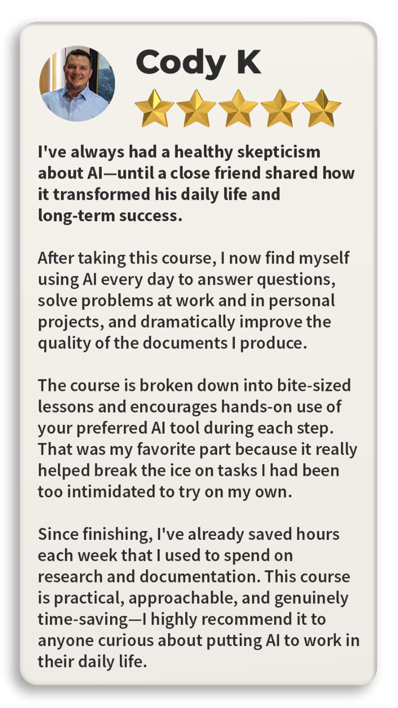 "This course changed how I view AI. It's not just a better Google search it's like having a team of analysts available to solve any issue or plan any project.