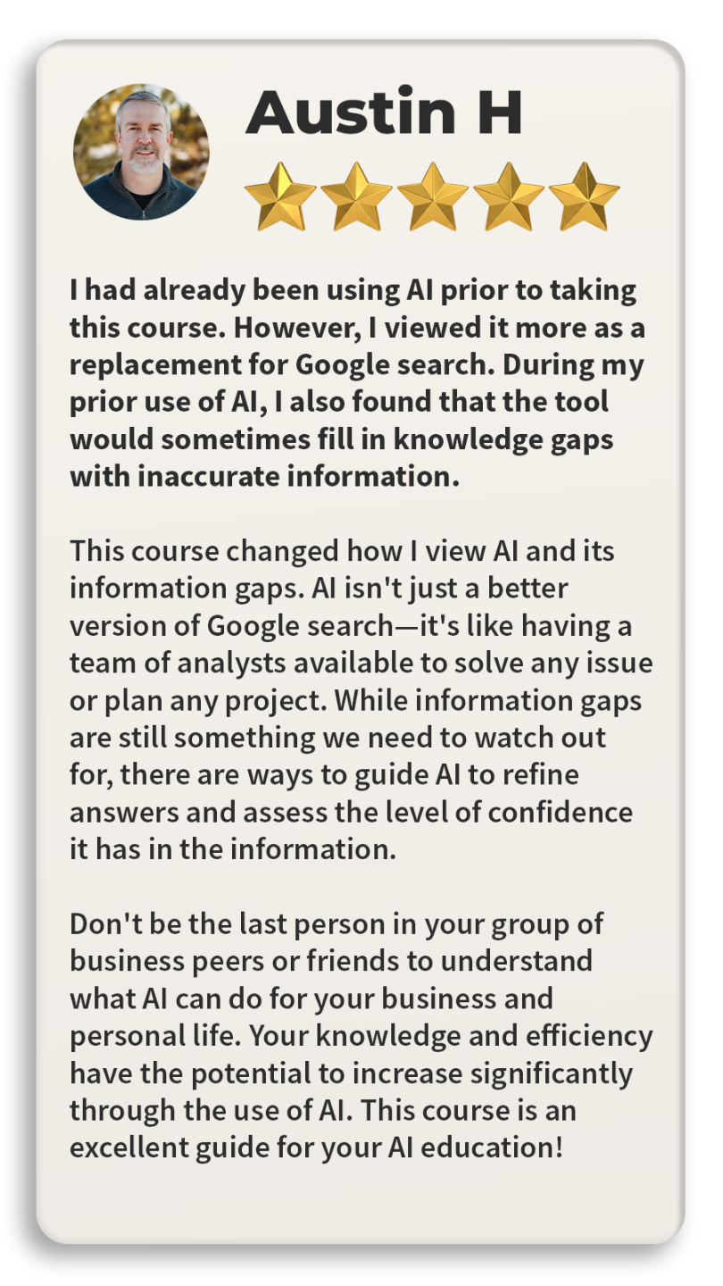 This course teaches you the 3-part AI system that saves business owners, tradespeople, and busy professionals 5-10 hours every week without becoming dependent on technology or losing your personal touch.