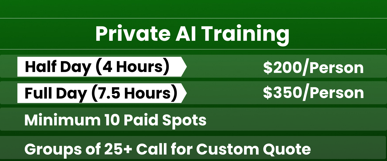 Best if you want the strongest results. The private training gets your team excited, aligned, and doing real work with AI. The course gives them the depth to keep building after the workshop ends. This is the combination where we see the biggest shifts.